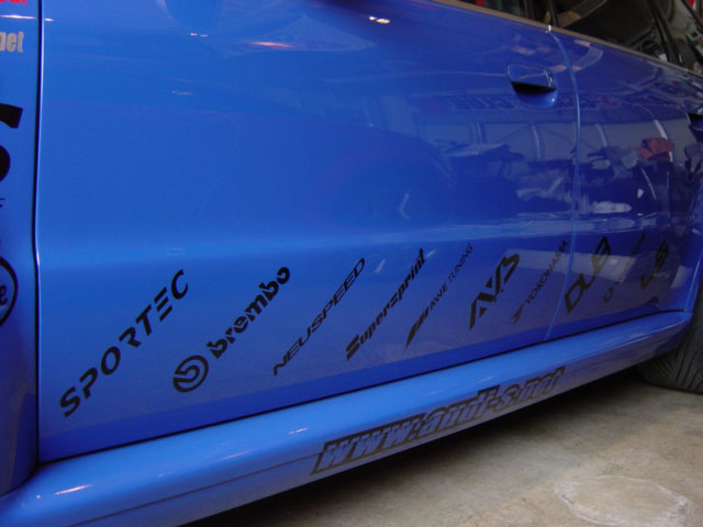 ●サマータイヤに履き替えを機についでに色々やりました。 ・フロントグリル同色ペイント ・SPORTEC MONO10 塗装 マッドブラック&ノガロブルーライン ・Brembo GT キット ・スポンサーステッカー&オリジナルステッカーの貼り付け |
