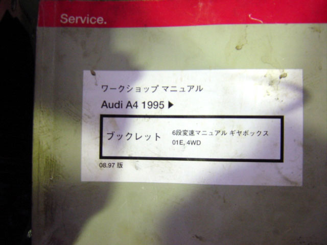 | ワークショップマニュアル AudiA4 1995〜 6段変速マニュアルギアボッ クス 01E..4WD この本に分解整備の手順、部品番号等がすべて書いてあります。 |